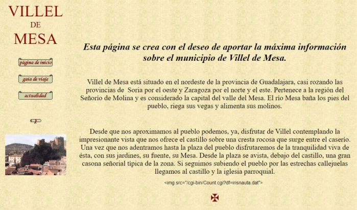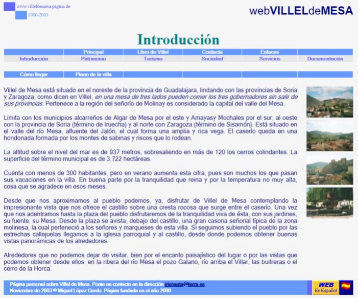 Último año del siglo XX y año en el que se popularizó Internet con aquel portal llamado Terra. Y con otro fósil tecnológico llamado Microsoft FrontPage, se crea la primera  versión de villeldemesa.com; revelando fotos en papel, dibujando con Paint y esbozando lo que será el libro Villel de Mesa, apuntes sobre esta villa (2002).
